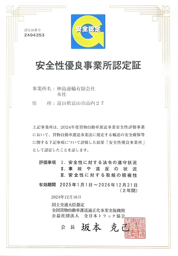 (安全性優良事業所)一般社団法人 全日本トラック協会より、安全性優良事業所として認定を受けています。